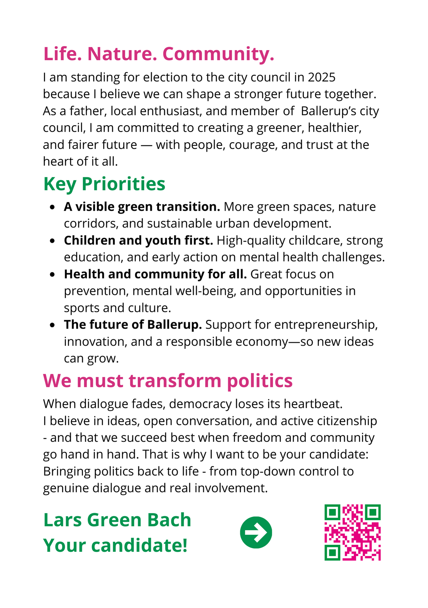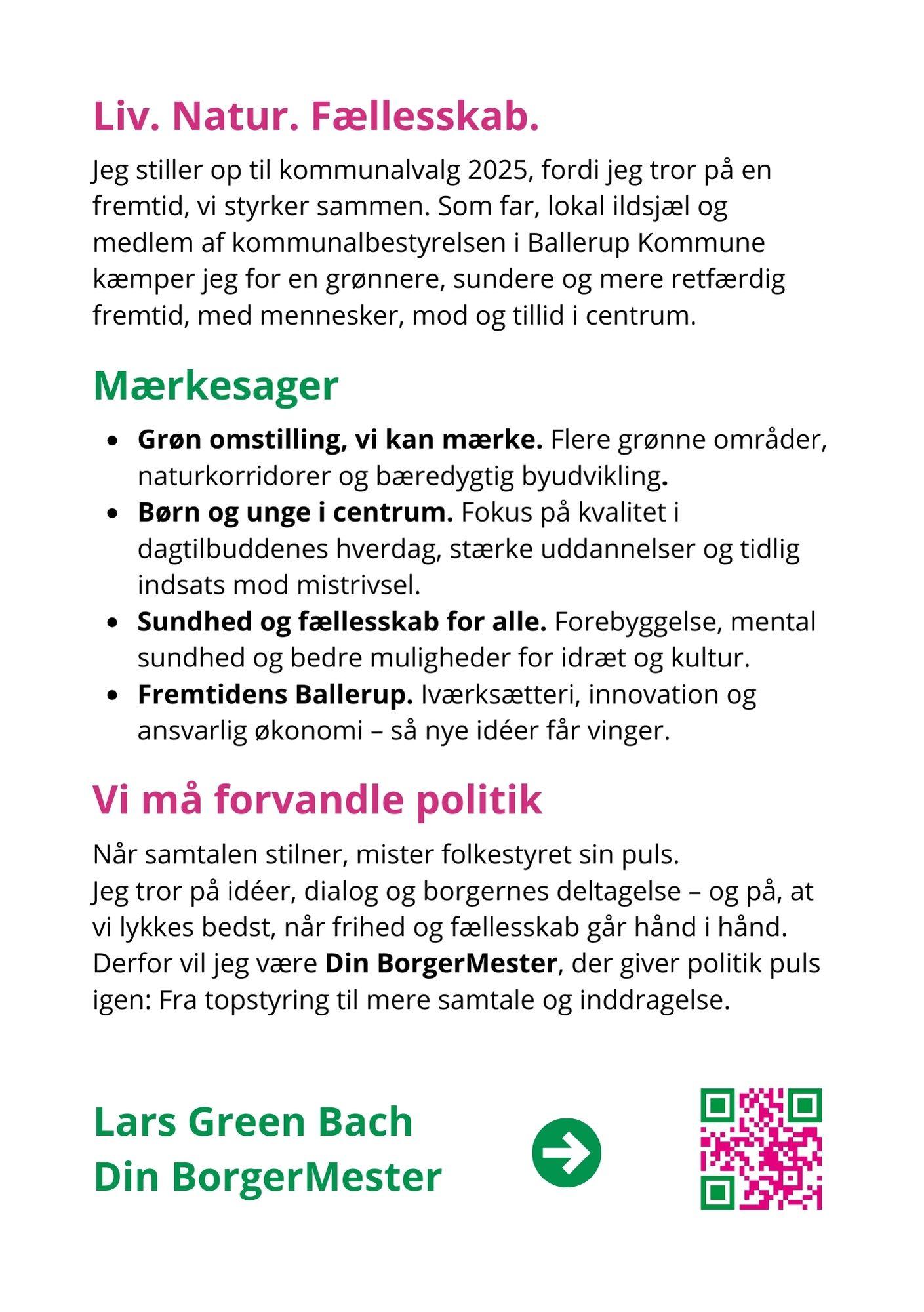 Jeg sætter fremtiden i fokus og vil gerne skabe de forandringer, som skal til, og ser frem til at samarbejde med jer alle for at gøre visionen til virkelighed.